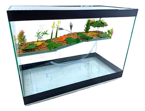 Aquário terrário de vidro decorado (50x25x35 cm). Indicado para tartarugas de pequeno e médio porte, combina área aquática e terrestre em um ambiente resistente e prático.