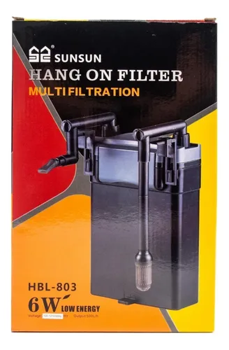 Filtro externo hang-on Sunsun HBL-803 com vazão de 500L/h. Modelo mini canister eficiente, ideal para aquários de pequeno e médio porte, mantendo a água limpa e saudável.