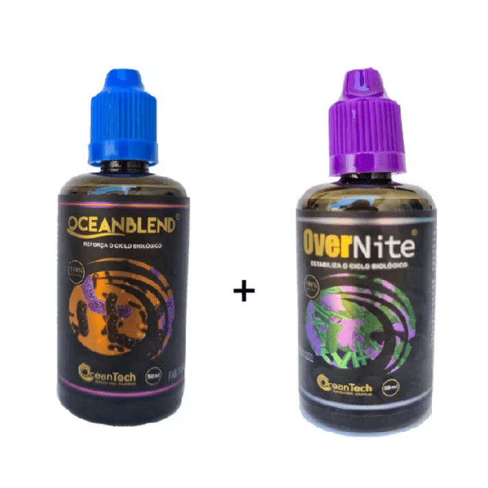 O OceanBlend reforça o ciclo biológico do aquário, estimulando a multiplicação de bactérias benéficas que mantêm a água saudável e estável. Já o OverNite acelera a ciclagem e estabiliza o ambiente de forma prática, reduzindo riscos de picos de amônia e nitrito.
